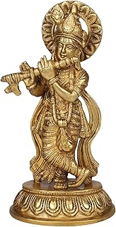 Kartique Brass Krishna Bhagwan Murti Idol in Flute Playing Posture on Beautiful Pedestal Home Decor Entrance Statue Office Table Height 8.5 Inch