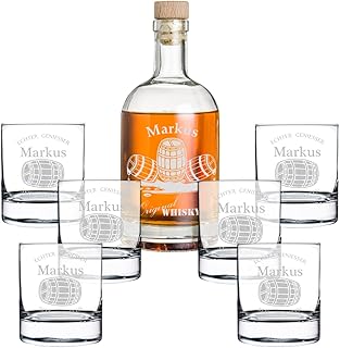 Coffret Cadeau 7 pièces Personnalisé avec Gravure - Bouteille de Whisky et 6 Verres à Whisky - Carafe en Verre Contenu: 700ml - idée Cadeau pour Les Hommes - Le Baril de Whisky Motive