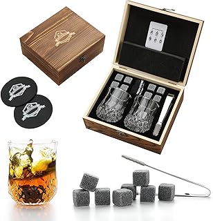Coffret Pierres à Whisky et Verre à Whisky - 8 Roches de Whisky en Granit et 2 Verres dans Une boîte en Bois - pour Les Hommes Fête des pères Anniversaire de Papa Noël
