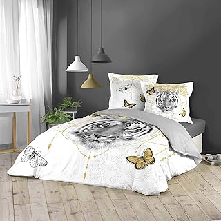 L22G Parure De Lit Tigre Blanc (Housse De Couette 220x240cm + 2 Taies 63X63cm) 100% Coton Savane